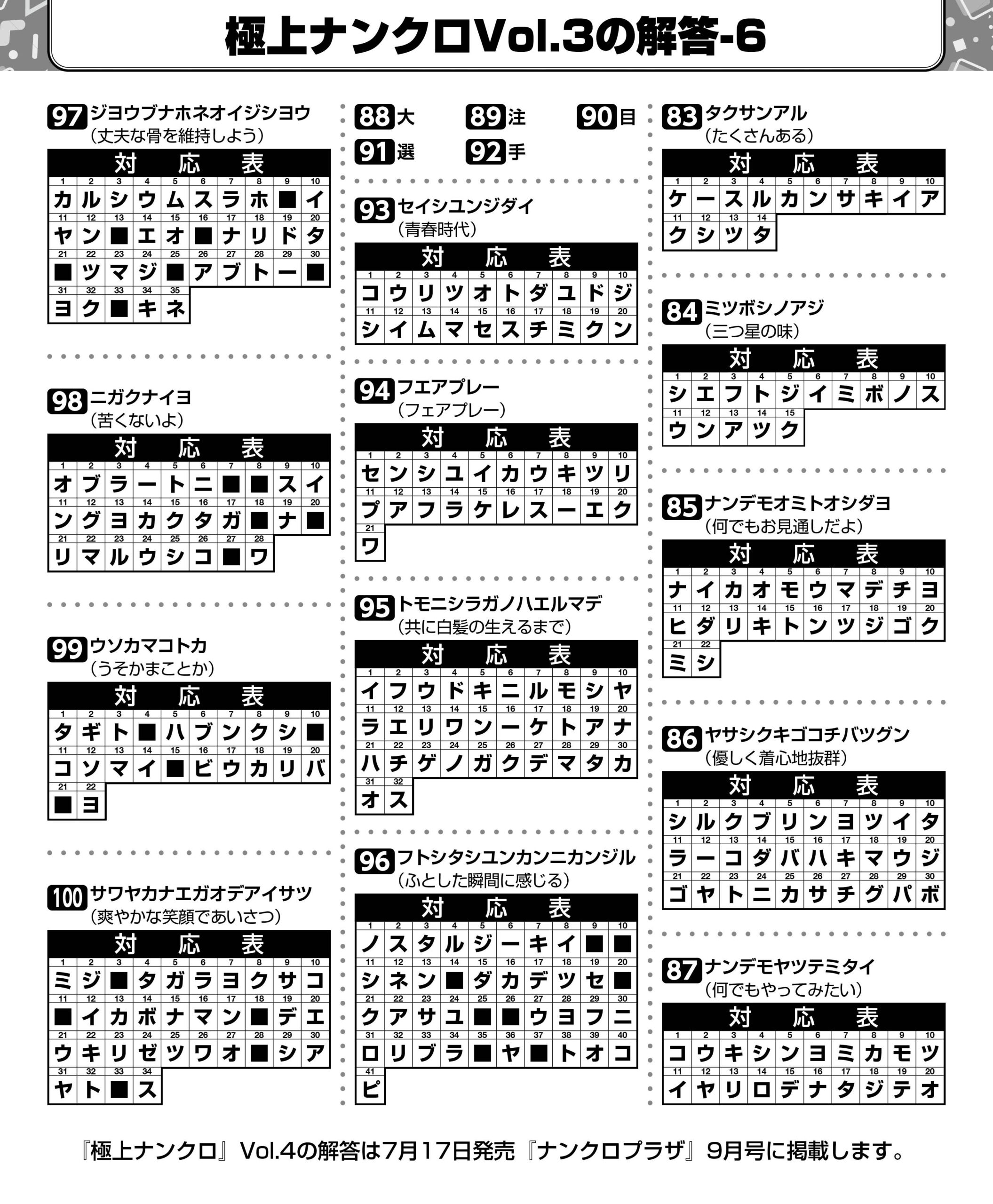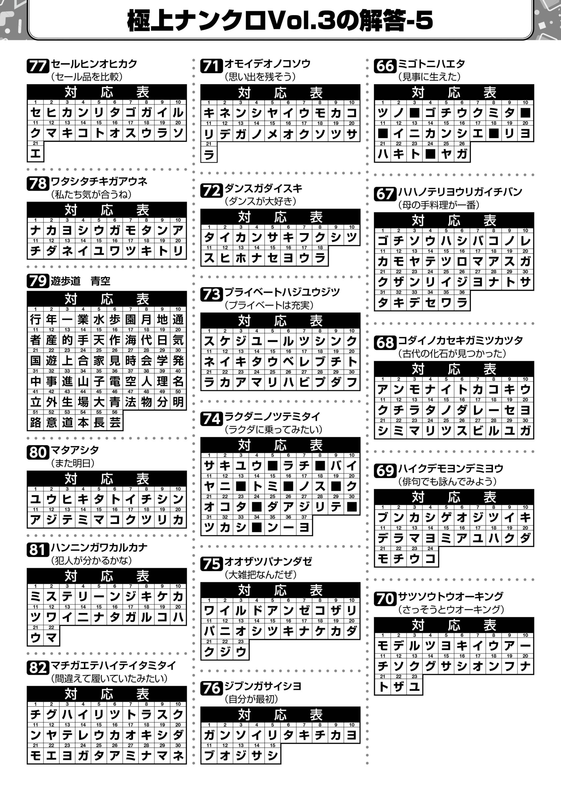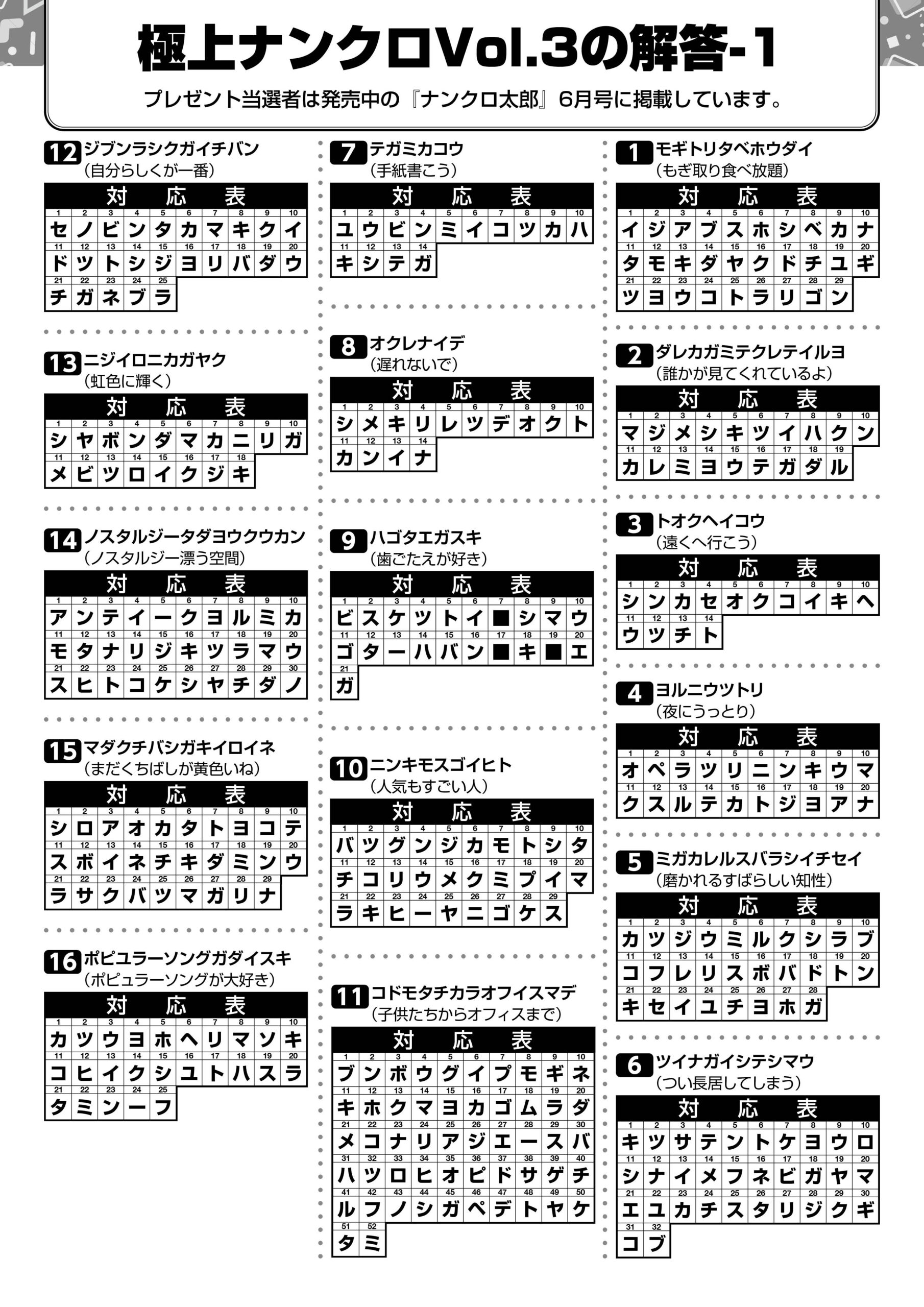 『極上ナンクロ』Vol.3の解答について 2025年10月発行の『極上ナンクロVol.3』解答をこのページにて公開いたします。 当選者につきましては『ナンクロ太郎』6月号(4月17日発売)にて発表しております。 たくさんのご応募をいただきありがとうございました。 なお、『極上ナンクロ』Vol.5は5月発売予定でしたが、延期になっております。楽しみにしていただいている読者のみなさまには申し訳ございません。 決まり次第またお知らせさせていただきます。 今後とも当社のパズル誌をご愛顧くださいますようよろしくお願いいたします。 ナンクロ編集部
