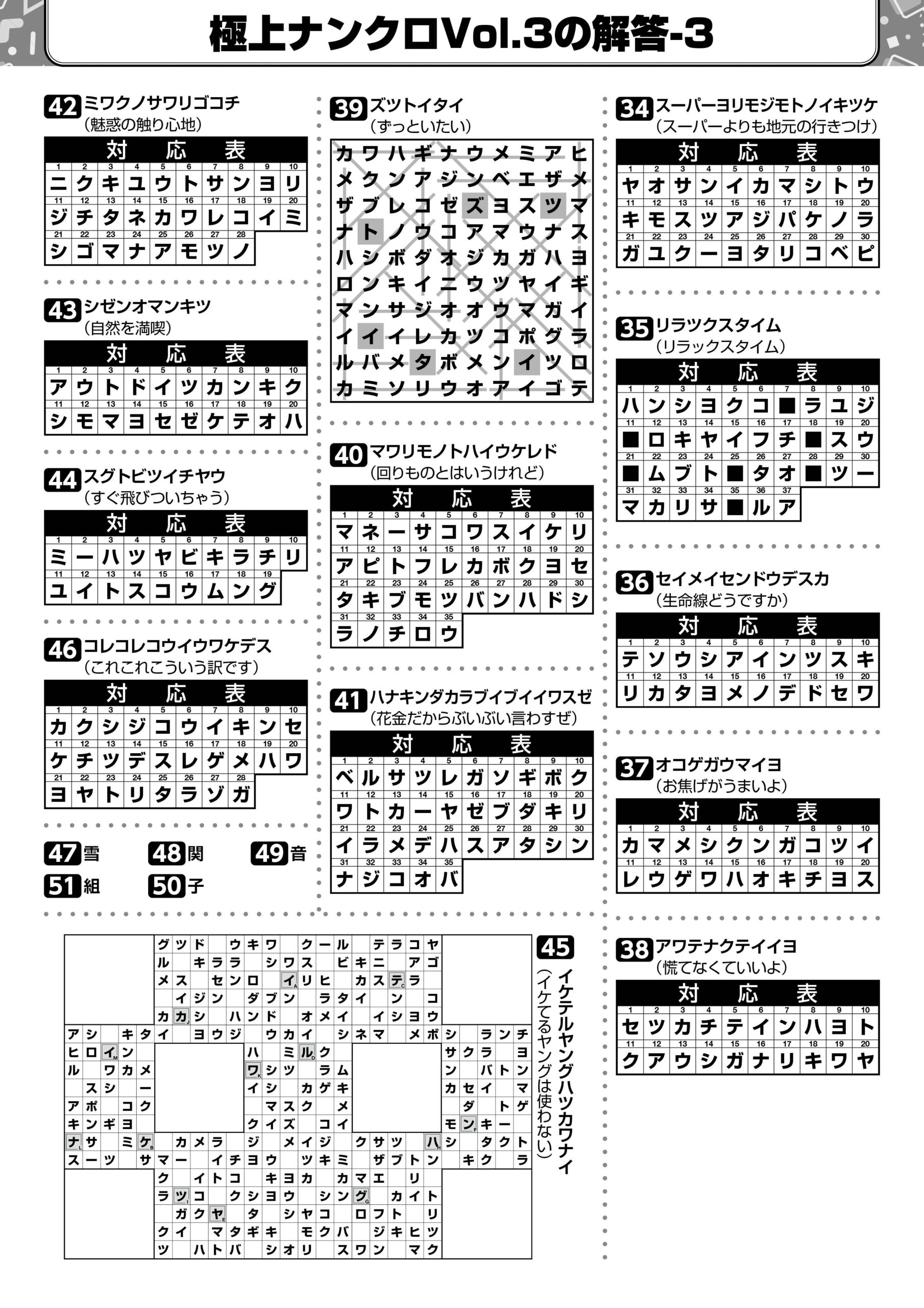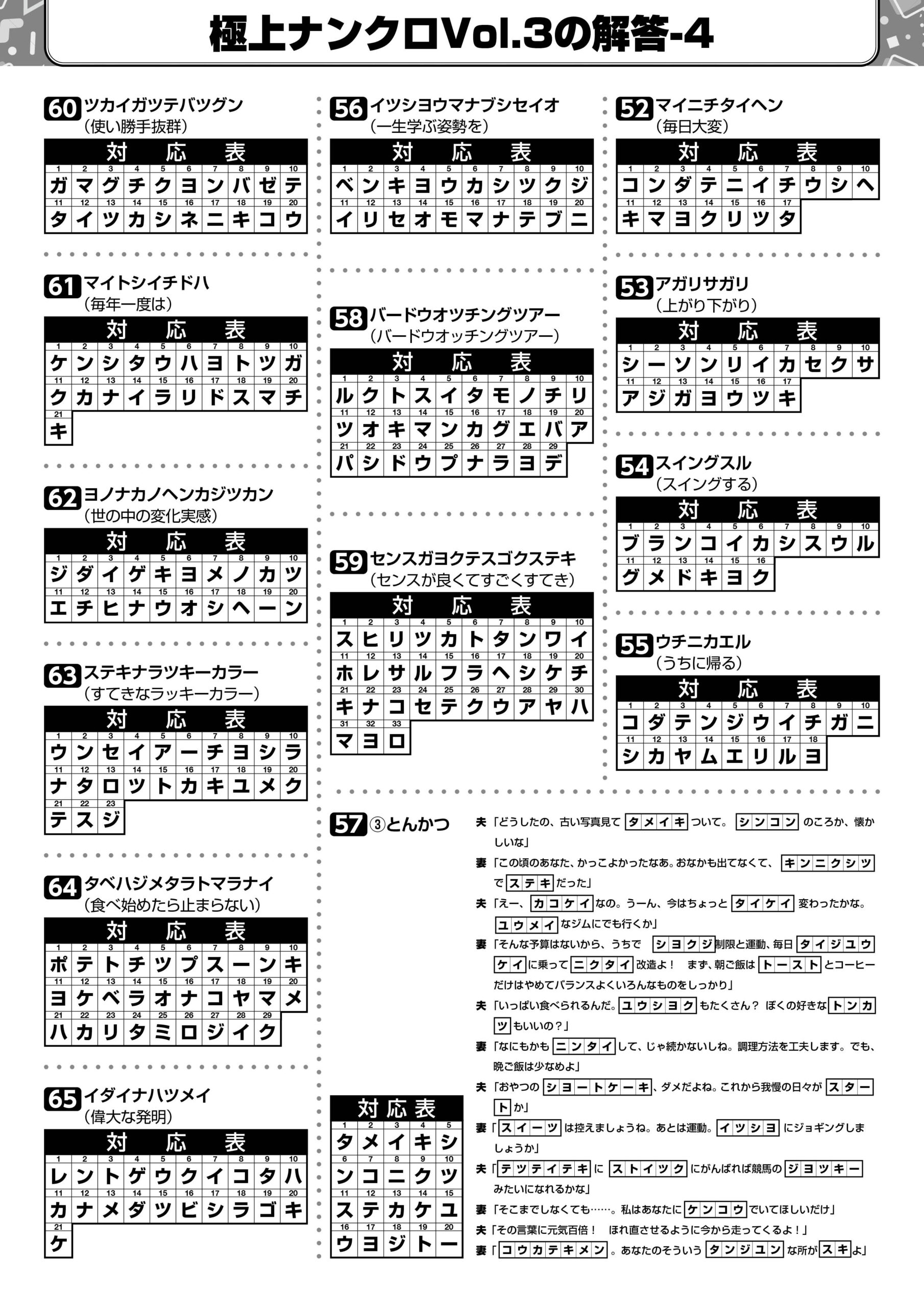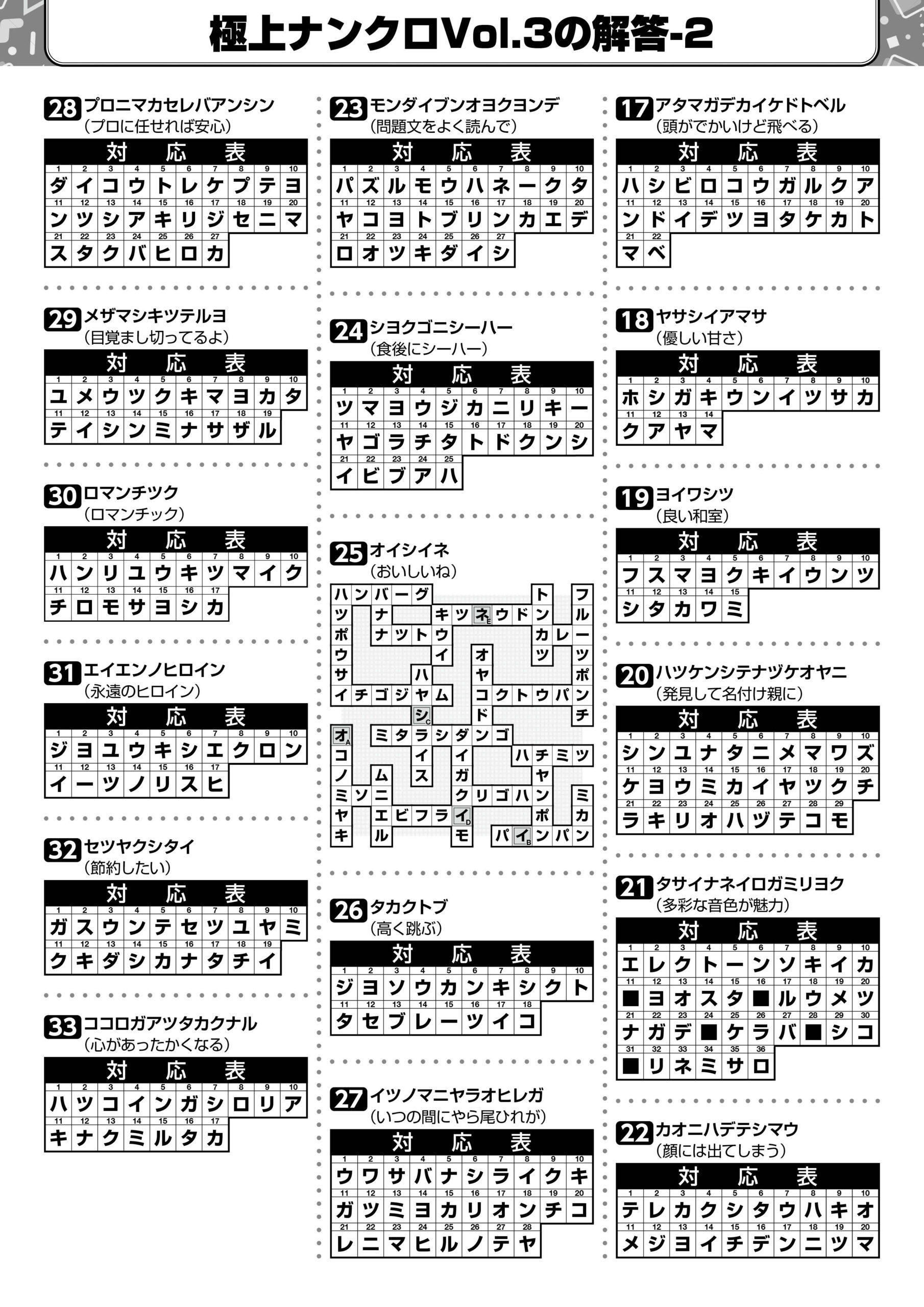 『極上ナンクロ』Vol.3の解答について 2025年10月発行の『極上ナンクロVol.3』解答をこのページにて公開いたします。 当選者につきましては『ナンクロ太郎』6月号(4月17日発売)にて発表しております。 たくさんのご応募をいただきありがとうございました。 なお、『極上ナンクロ』Vol.5は5月発売予定でしたが、延期になっております。楽しみにしていただいている読者のみなさまには申し訳ございません。 決まり次第またお知らせさせていただきます。 今後とも当社のパズル誌をご愛顧くださいますようよろしくお願いいたします。 ナンクロ編集部