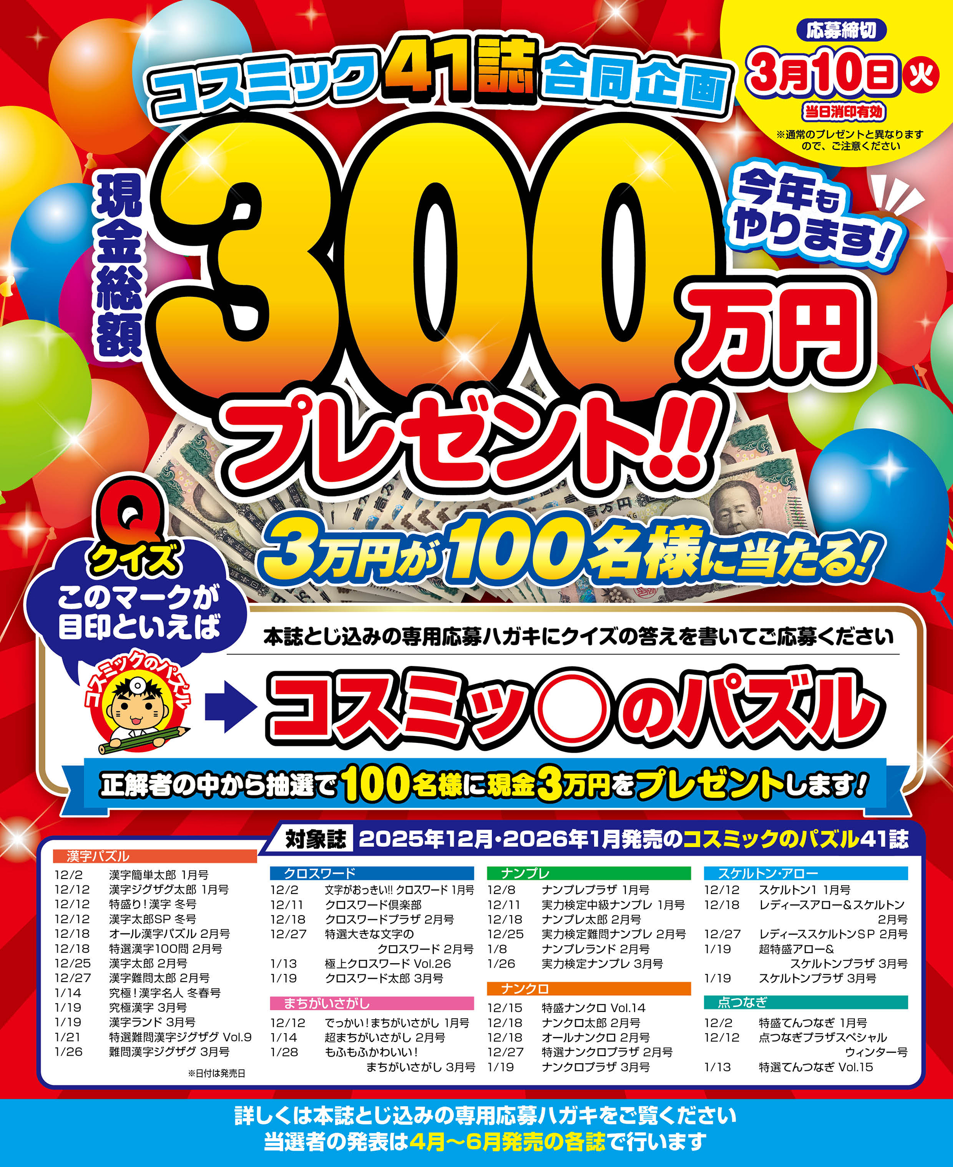 【対象誌】2025年12月・2026年1月発売の下記のパズル誌